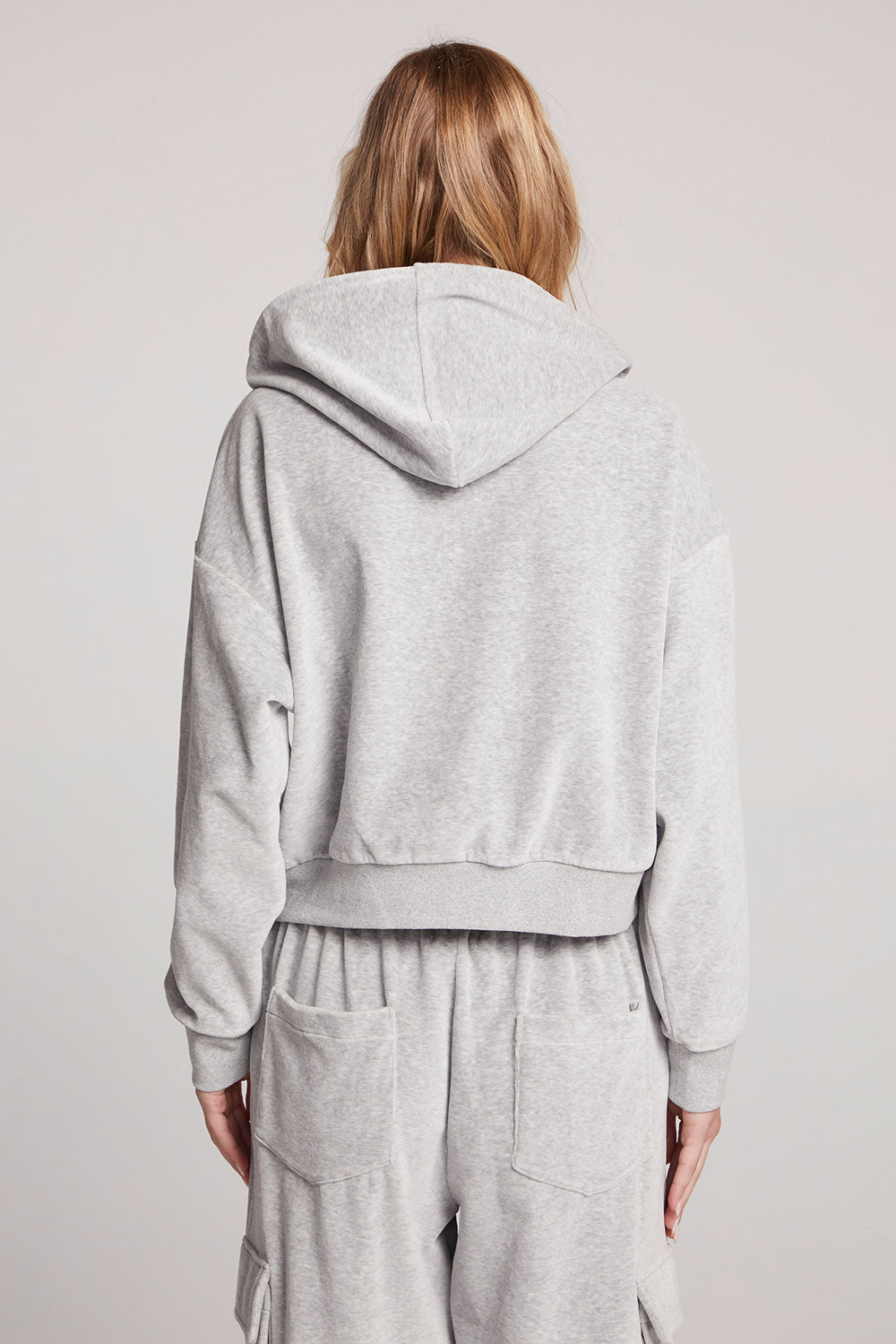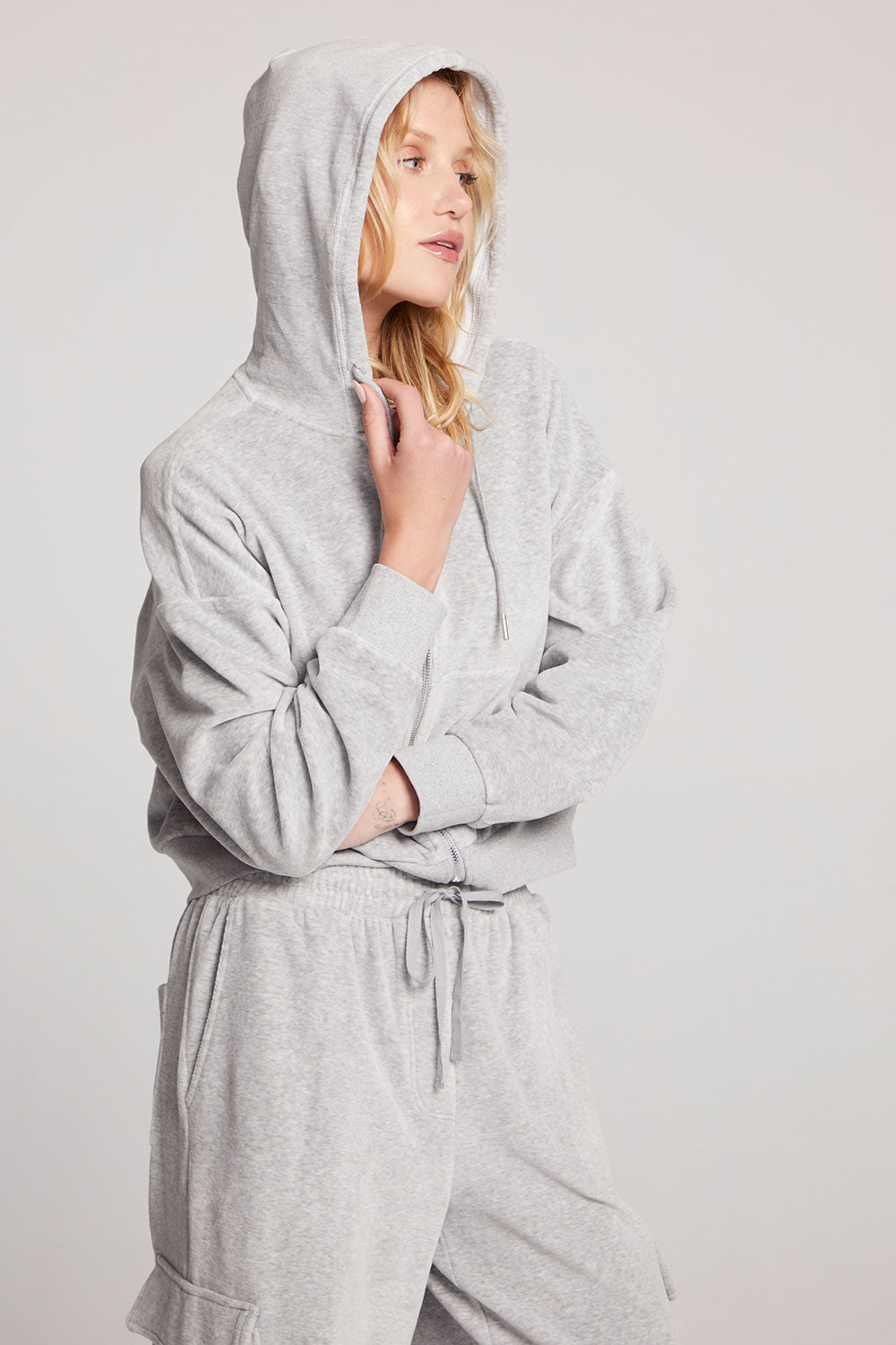 Made from a soft velour blend, it features a full-zip front, roomy hood, and relaxed fit that transitions from lounging at home to stepping out in effortless style.