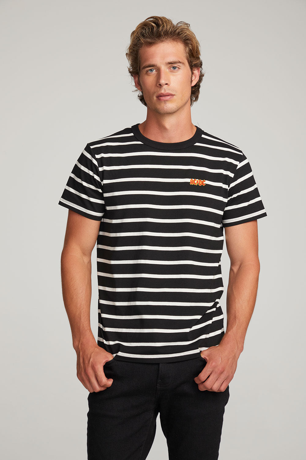 Embrace the timelessness of AC/DC with this men's short-sleeved black and white striped shirt with the band's logo embroidered. Australian band AC/DC is a staple on the rock n' roll scene and this men's tee is a must-have for fans. This soft and stylish shirt will be an instant favorite.