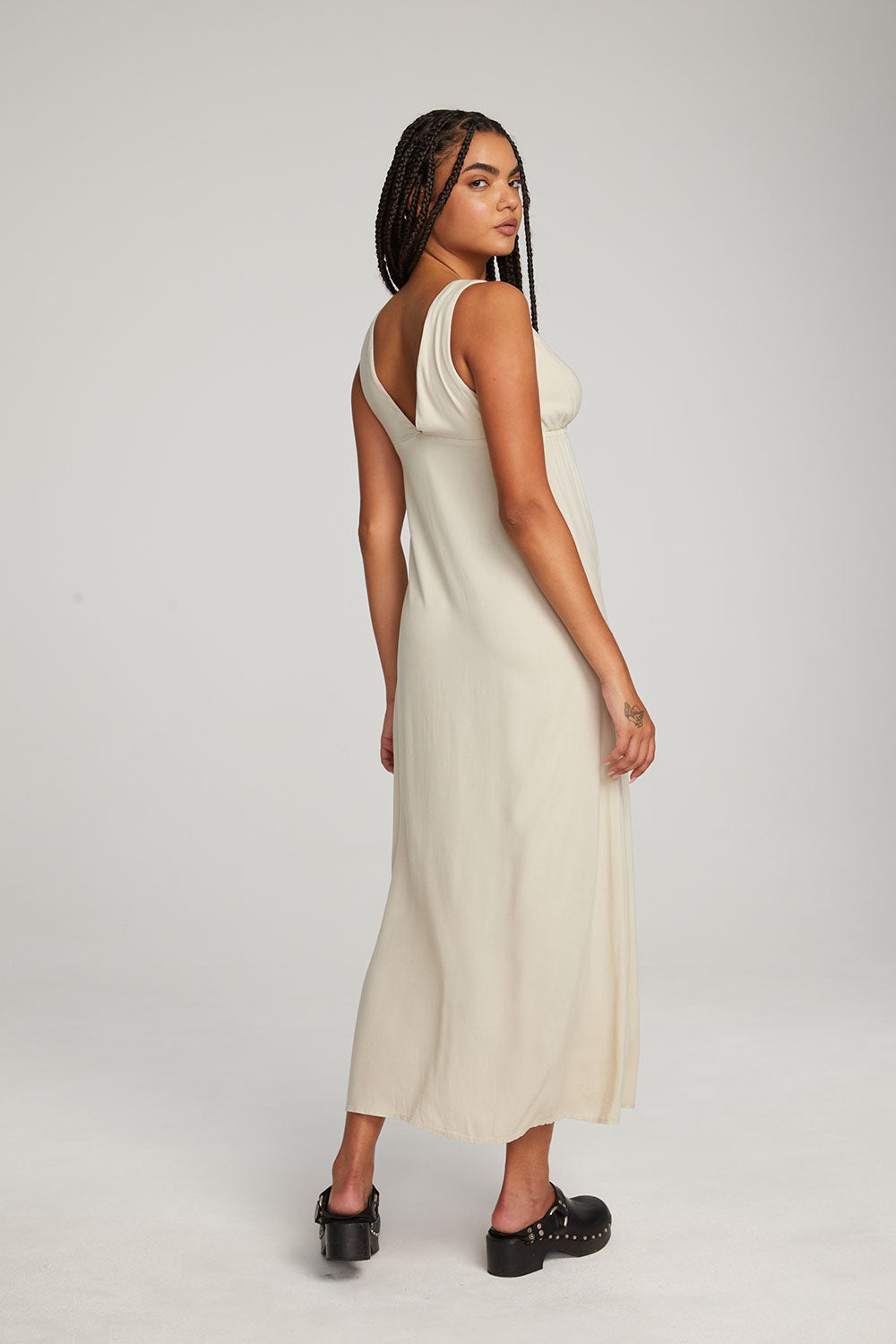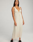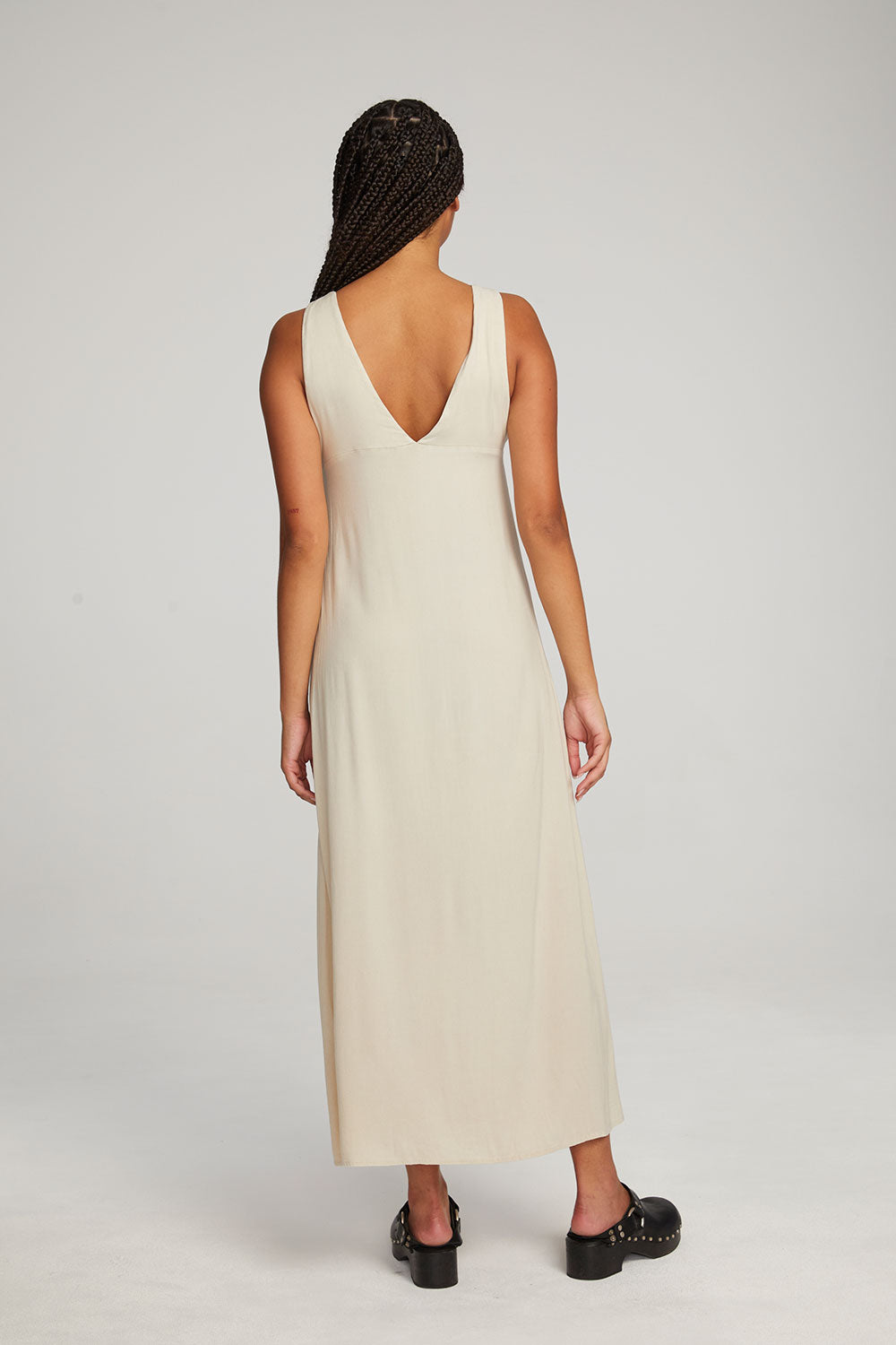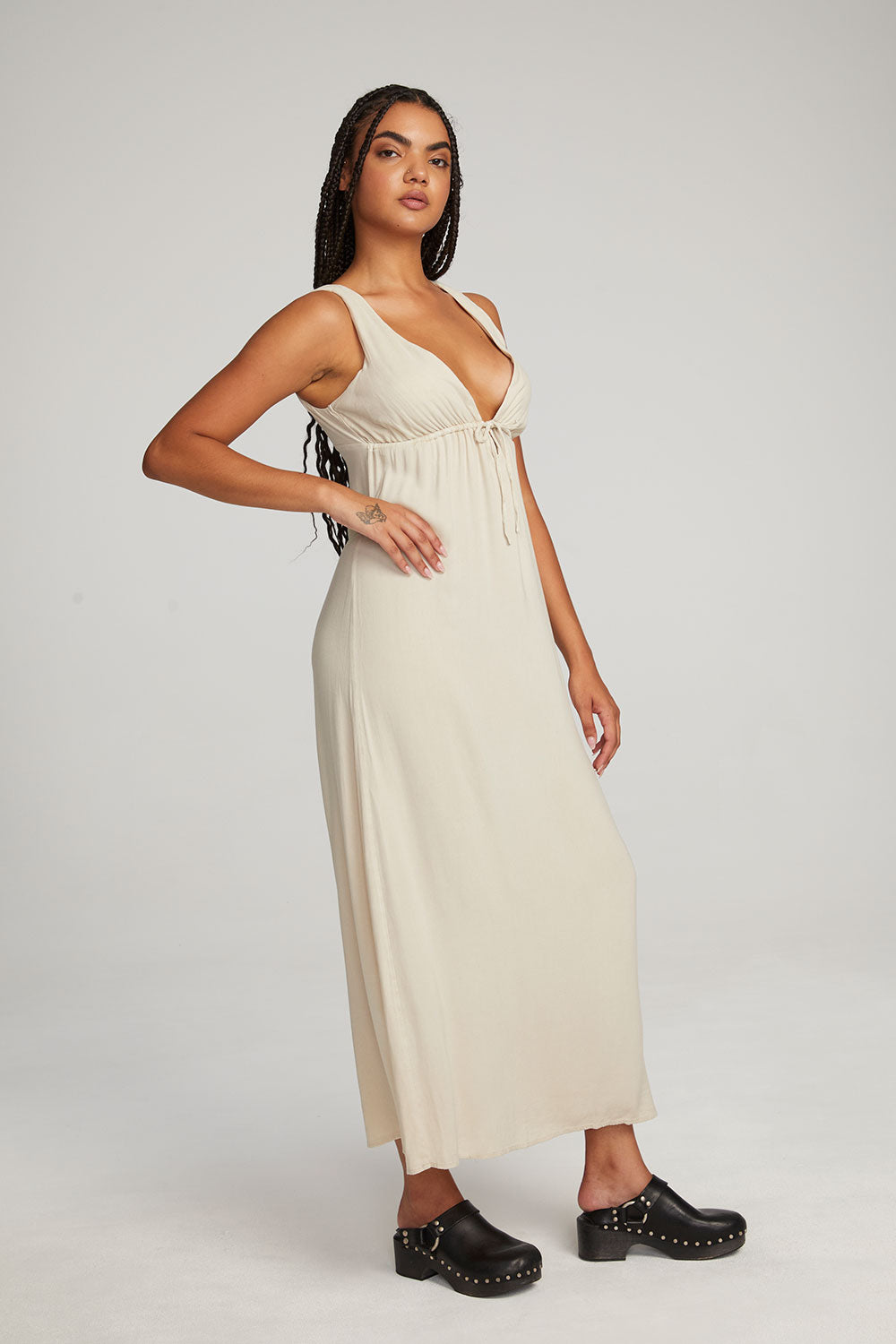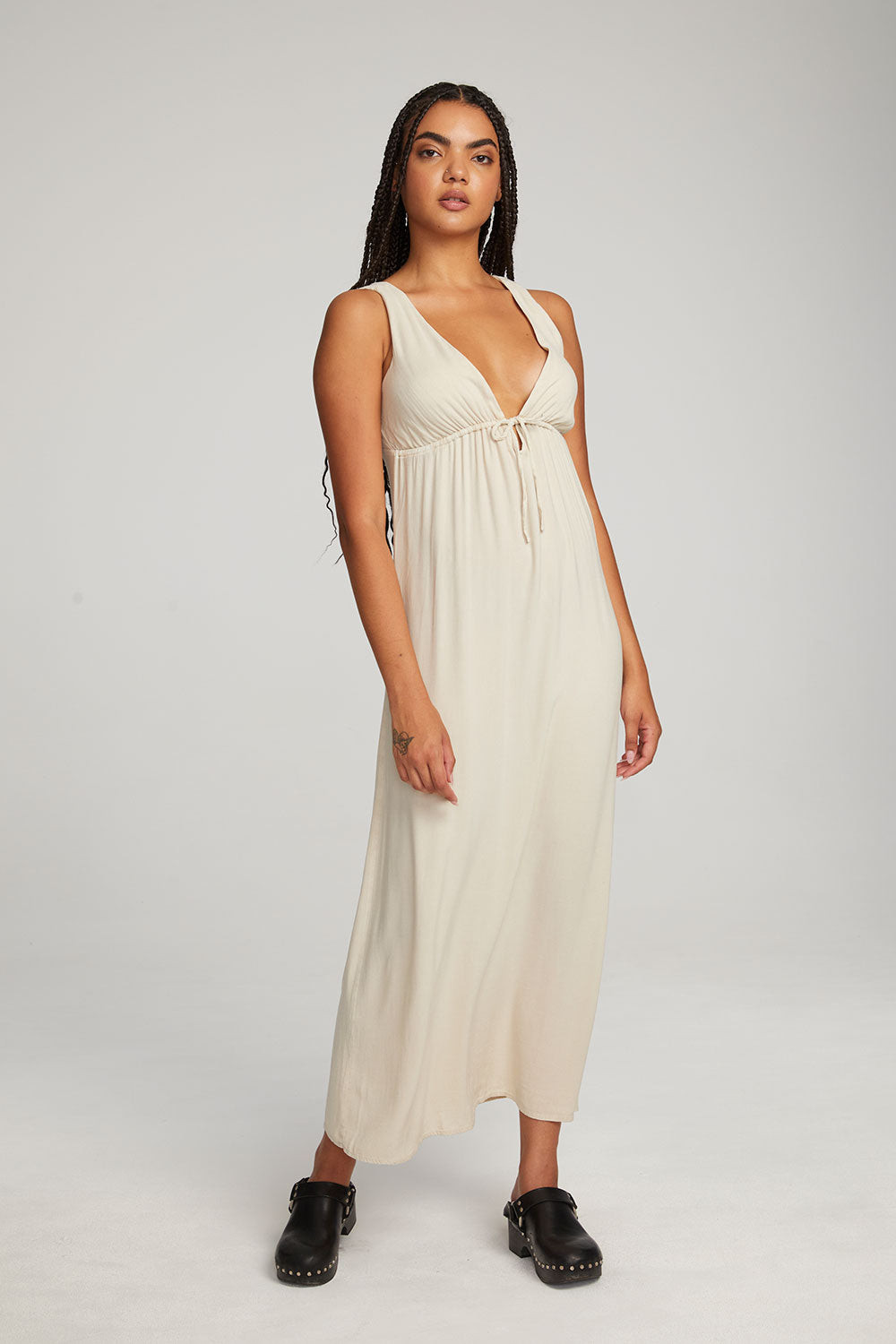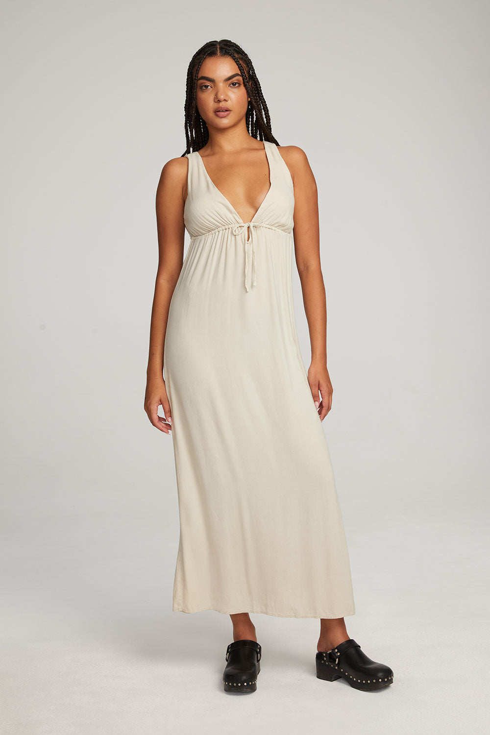 Your spring wardrobe isn't complete with the Aubrey Dress in bark. Perfect for festival season or a night out, this simple maxi with a deep v-neckline gives a boho chic vibe that's laid-back and stylish for any occasion.