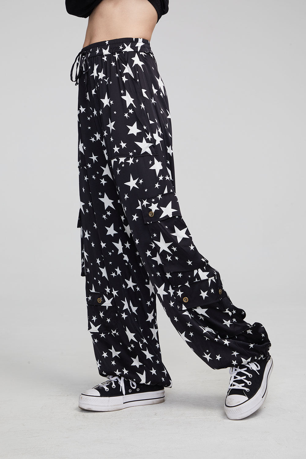 A must-have for any wardrobe, our Billyy Walk of Fame Trousers offer a stylish blend of aesthetics and comfort with their slightly stretchy viscose fabric, cargo pockets, drawstring waist, and star print.