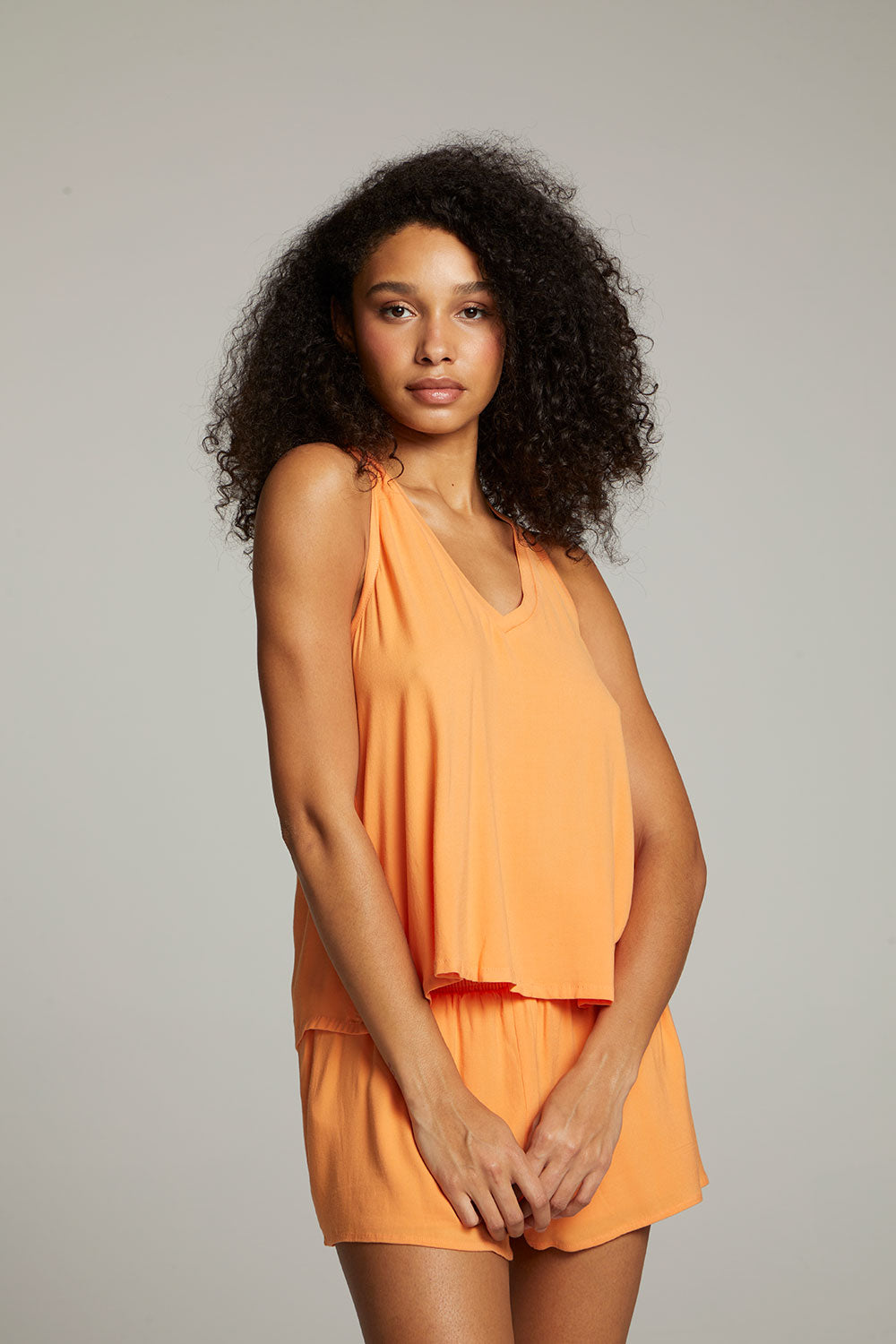Add a pop of color to your closet with the Carmel Tank Top in tangerine. A simple top can spice up an outfit and our Chaser Brand women's tank will enhance your summer wardrobe with its cheerful vibe and colorful hue. Style with the Electra Shorts in Paradise Mystic print sold separately.