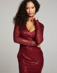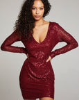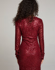 With a high hem, sequins, and a scoop neck, it’s clear the Christine mini dress is here to party. Long, close fitting sleeves, and a flatteringly draped body complete the look. The blood red colorway radiates effortless date-night flirtation.