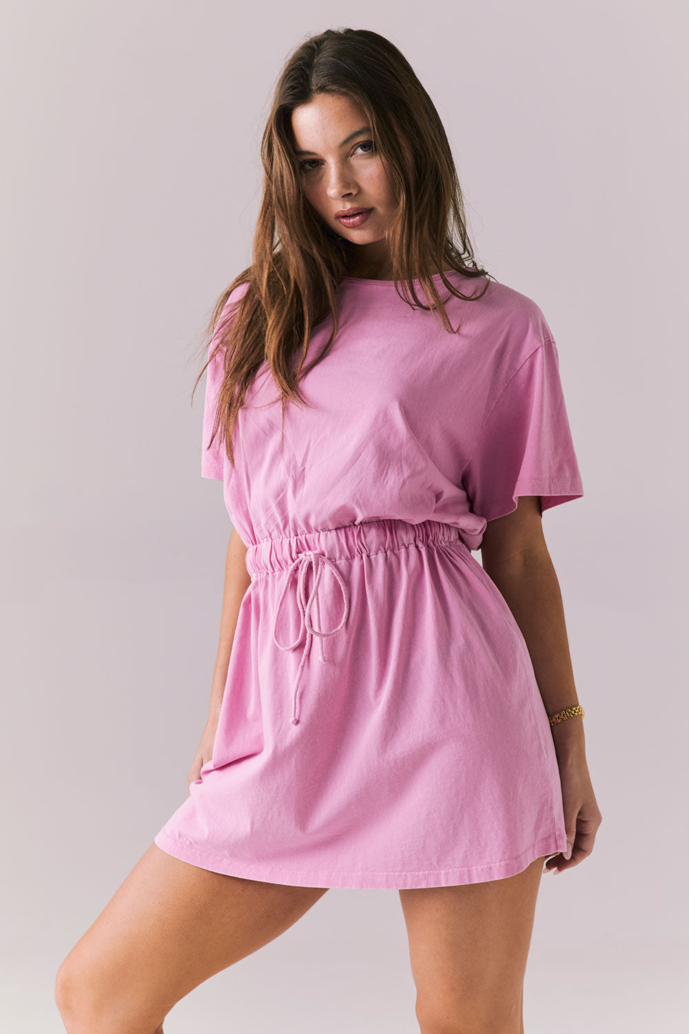 Inspired by 90s aerobics styles, this bright Bubblegum mini t-shirt dress features a pull tie at the waist for a fun and playful look.