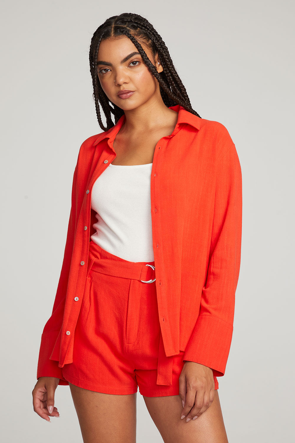 Take a bold stand for your next meeting or presentation in the Helena Button Down in flame. Get a vibrant polished look that's sure to grab attention. Perfect for work meetings, the office, or anywhere you want to make a statement.