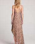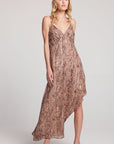 Spaghetti straps, a plunging neckline, and an asymmetrical hem summon 70s charm.