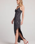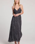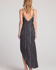 Featuring spaghetti straps, a plunging neckline, and an asymmetrical hem, this dress exudes 70s charm.