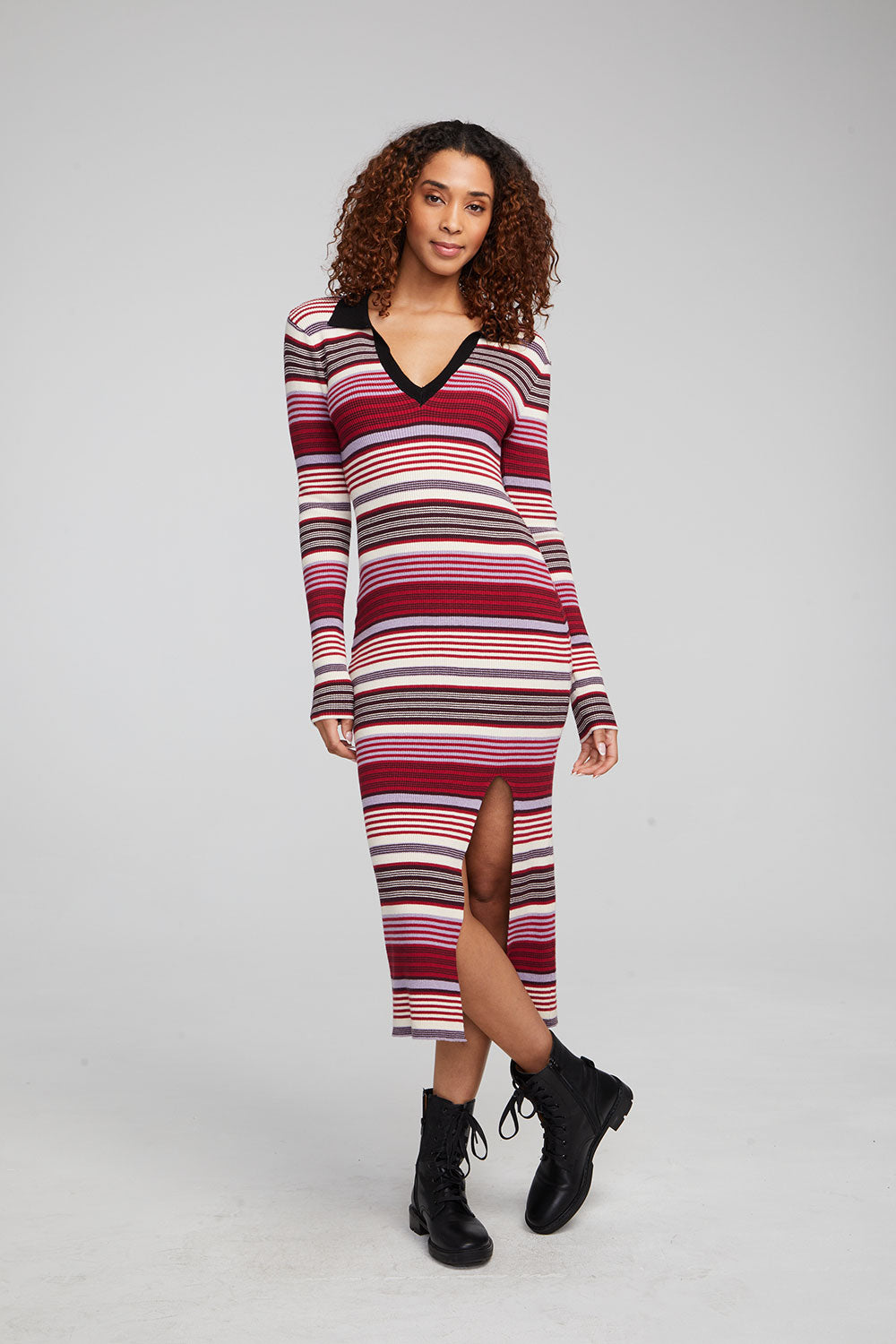 Our luxurious Palm Roxy Stripe Midi Dress, crafted from quality viscose, boasts a chic collared V-neck and a gentle slit at the side.