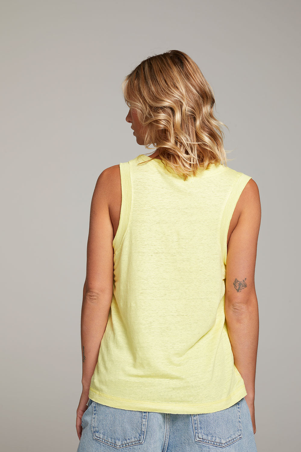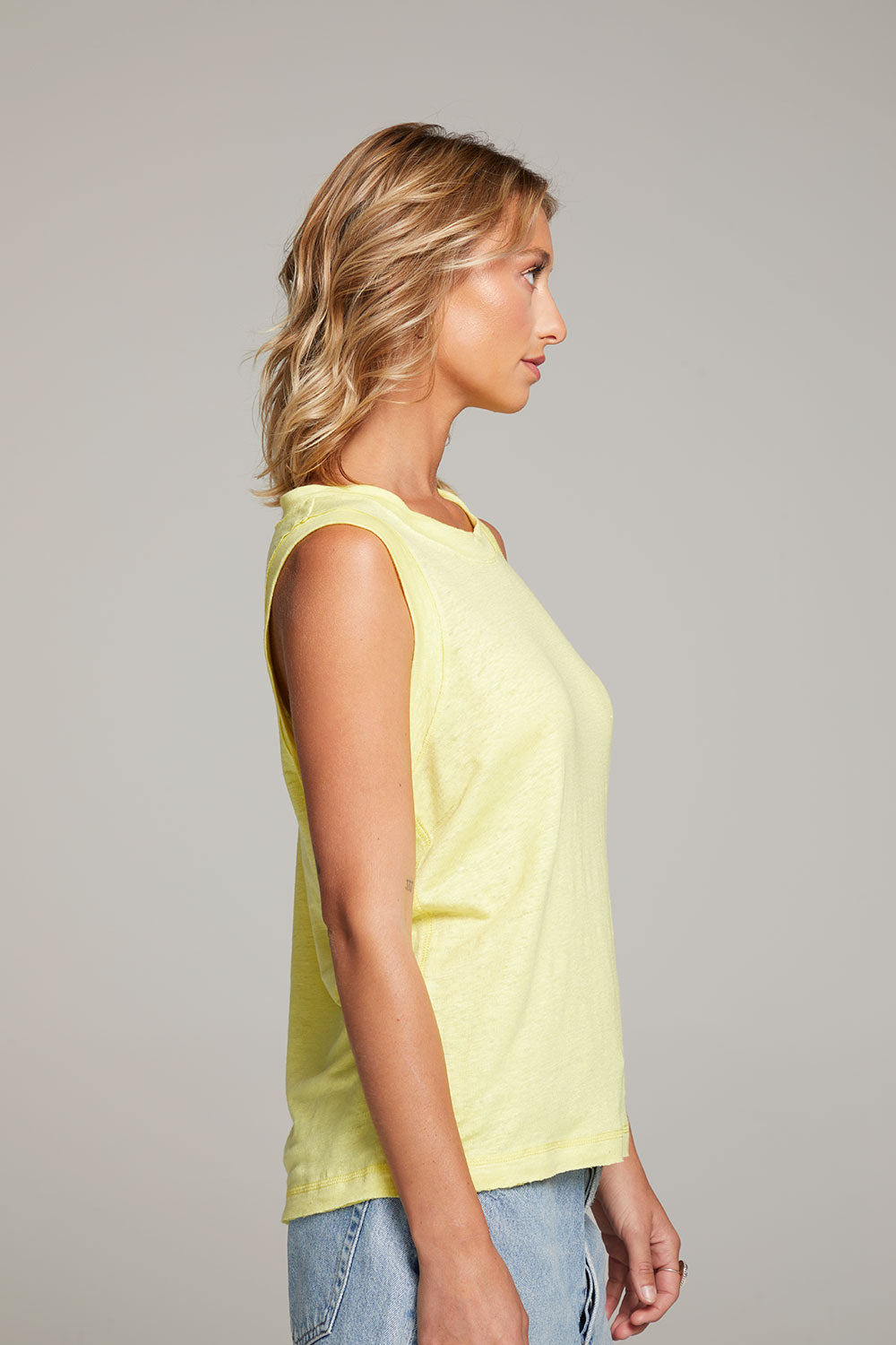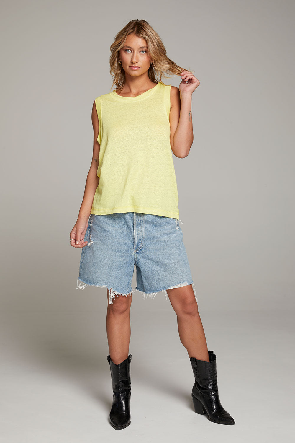 The Raw Edge Muscle Tank in a lemon hue is the perfect summer staple. Add a pop of color to your outfit with our spin on the classic tank. The easy-to-wear top can be worn alone or layered under your favorite blazer or cardigan. Style with high-waisted shorts and heels.