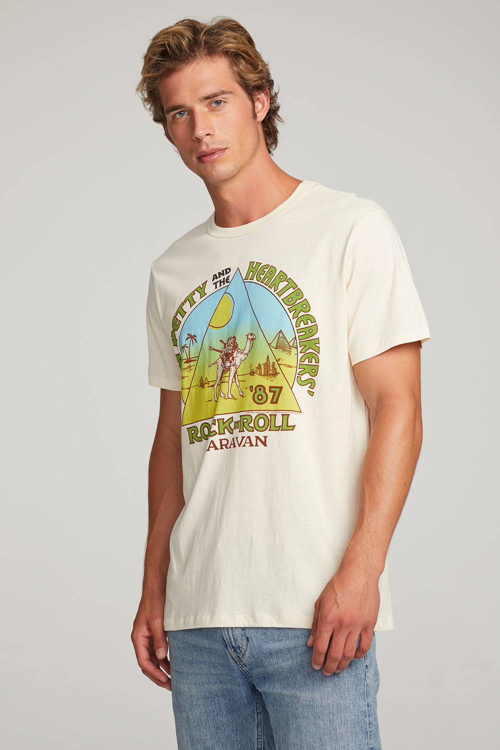 "Take back your insurance, Baby nothin's guaranteed," Tom Petty belted out in "Jammin," and while that is often true, we can guarantee you'll love this Tom Petty Rock N Roll Caravan men's short-sleeved in white cap grey. This graphic tee features a camel with the Egyptian pyramids in the background referencing their 1987 MTV contest that took one lucky fan to Egypt to see the sights and hang out with the band. To promote their seventh studio album, "Let Me Up (I've Had Enough)," Tom Petty and the Heartbreakers embarked on the Rock 'N' Roll Caravan Tour, with Georgia Satellites and Del Fuegos. This Chaser Brand pays tribute to one of the infamous posters from the '87 tour.