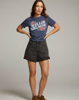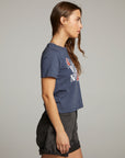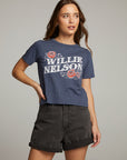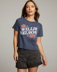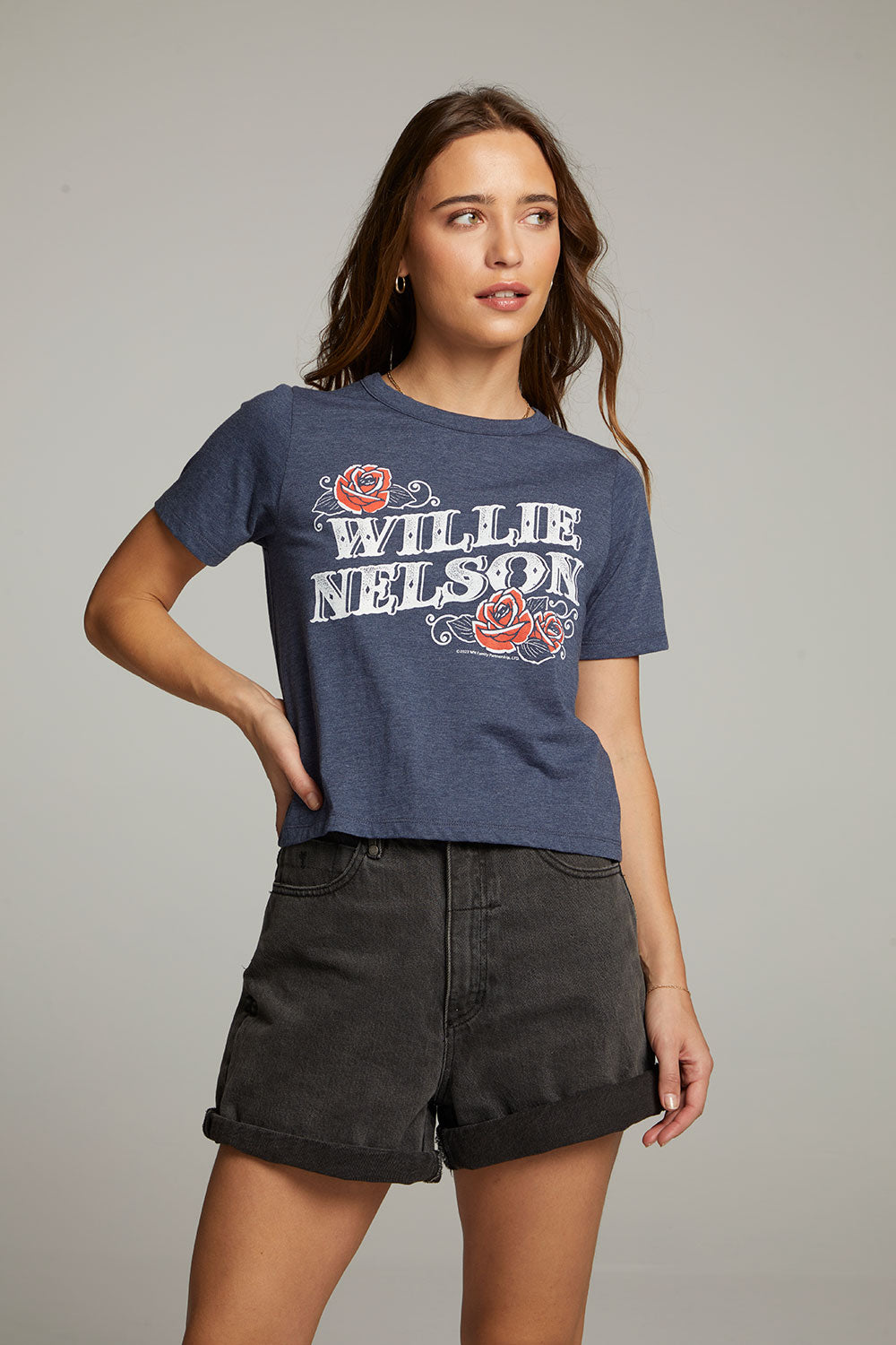 Celebrate the rebellious spirit and musical legacy of the original outlaw in the Willie Nelson Roses tee in a sapphire blue hue. At 91 years old, Willie Nelson is still performing and making music--last year he released "Bluegrass" and another new studio album "The Border" is expected to drop in 2024. Pay tribute to the American icon in our women's short-sleeved t-shirt that's comfortable and stylish. Pair with jeans and boots.