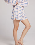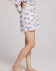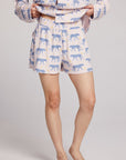 These charming shorts feature a unique Deco-inspired design with blue leopards roaming across the flowy fabric.