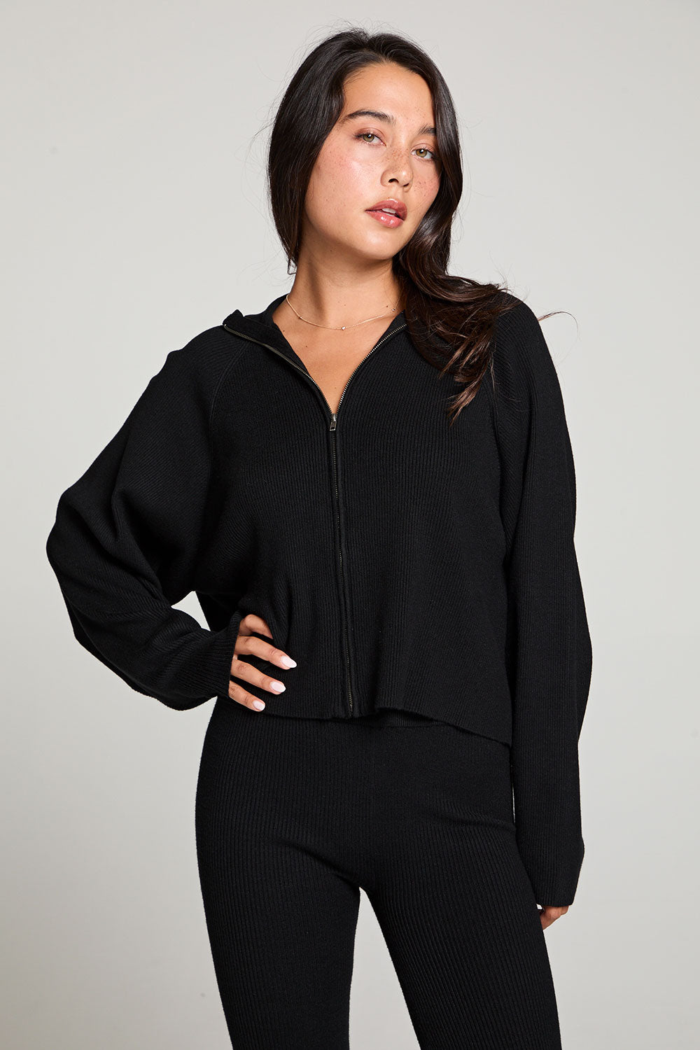Experience après ski chic with the Mccartneyy zip up in licorice black.
